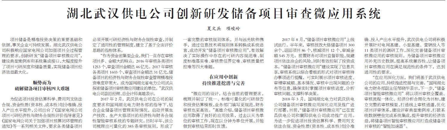 2018年3月,國網(wǎng)湖北電力對武漢供電公司儲備項目審核微應(yīng)用深化應(yīng)用及推廣進(jìn)行部署。目前,“儲備項目審核微應(yīng)用”已在宜昌供電公司和襄陽供電公司成功推廣應(yīng)用。為進(jìn)一步促進(jìn)項目投資估算科學(xué)、費(fèi)用列支依法合規(guī)、資金性質(zhì)(資本性、成本性)劃分準(zhǔn)確、投入產(chǎn)出水平提升,武漢供電公司將積極開展針對電網(wǎng)基建、小型基建、營銷投入等11類項目的調(diào)研工作,深化完善儲備項目審核微應(yīng)用的審核規(guī)則,為儲備項目審核微應(yīng)用補(bǔ)充歷史數(shù)據(jù),提高系統(tǒng)兼容性,讓儲備項目審核微應(yīng)用在滿足規(guī)范性的條件下,達(dá)到通用性的要求。